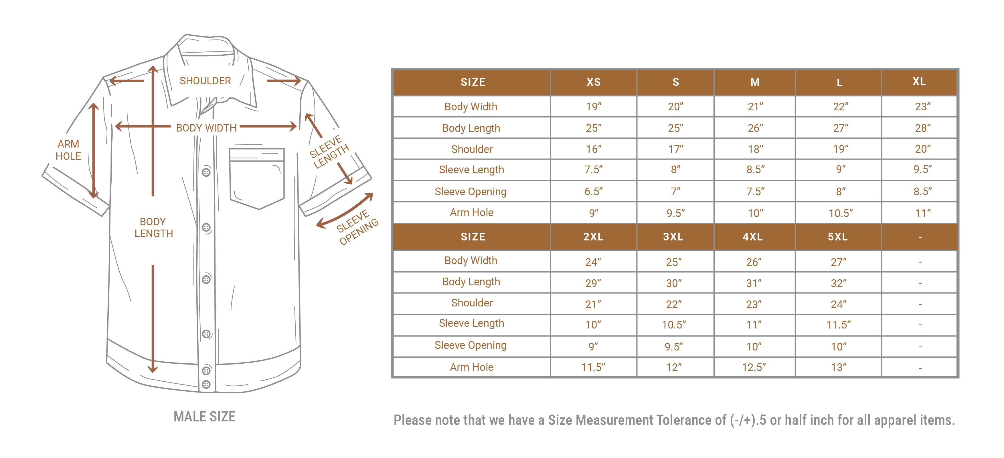 Please note that all apparel items have a size measurement tolerance of ±0.5 inch.